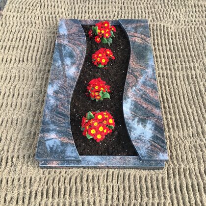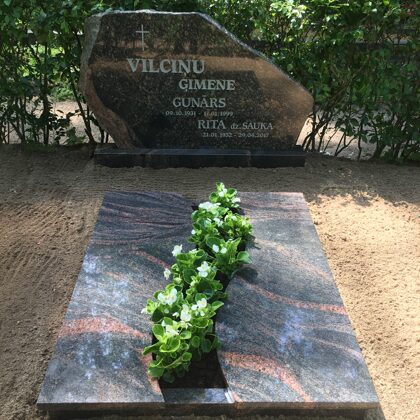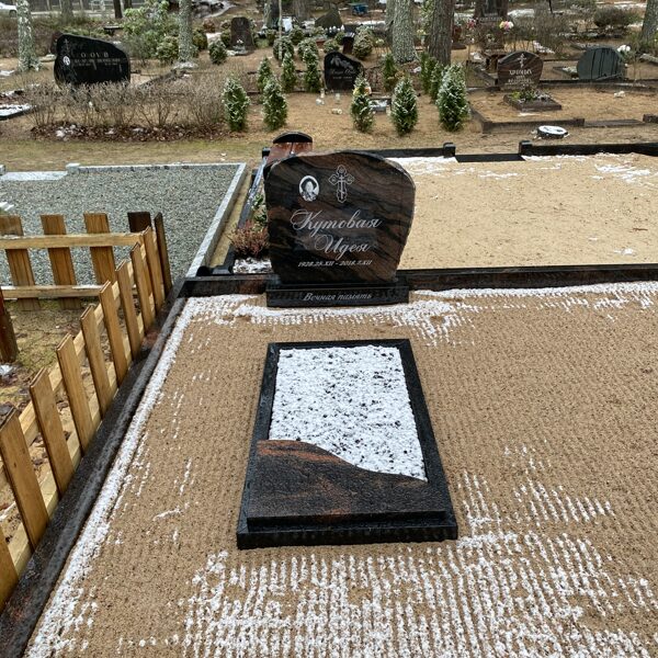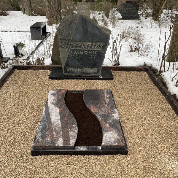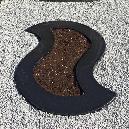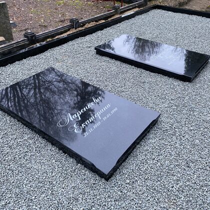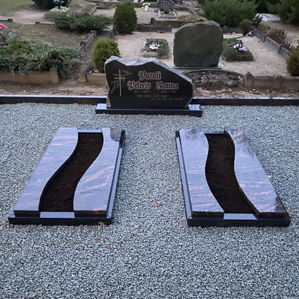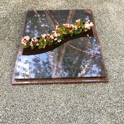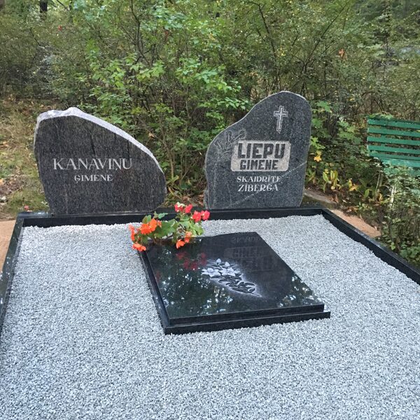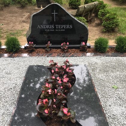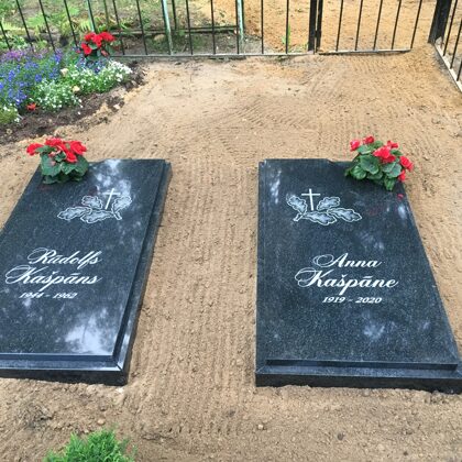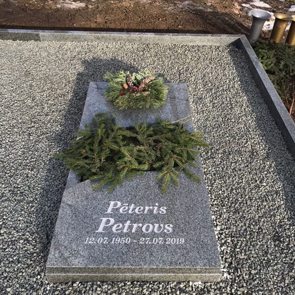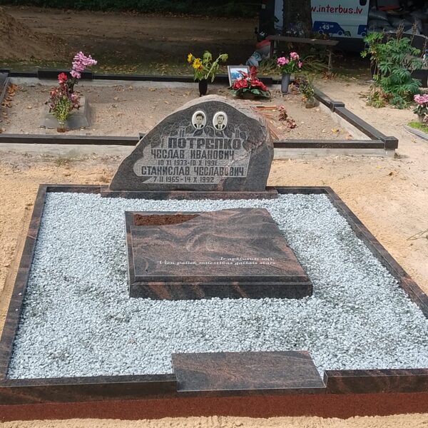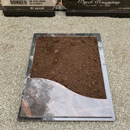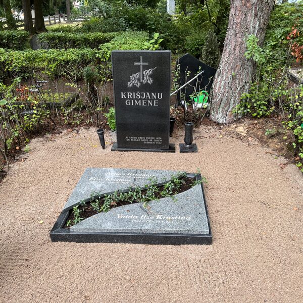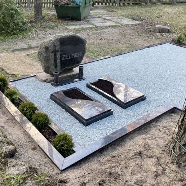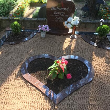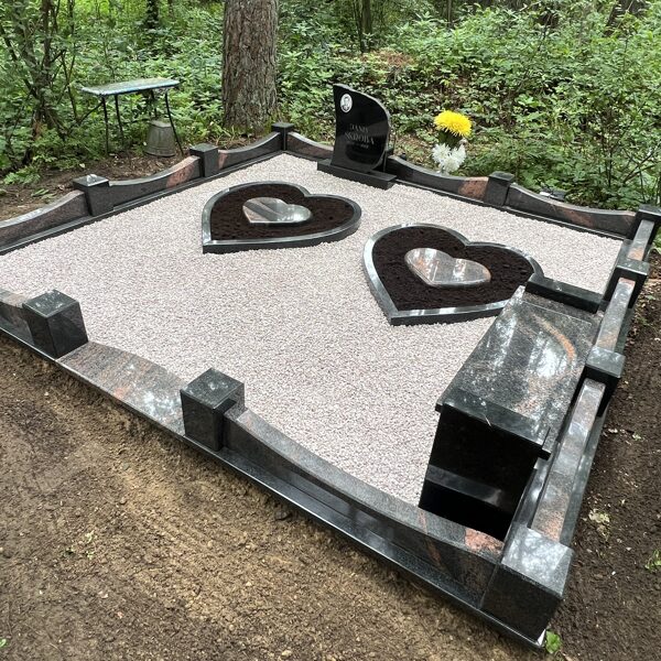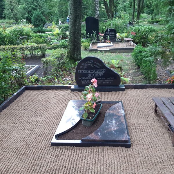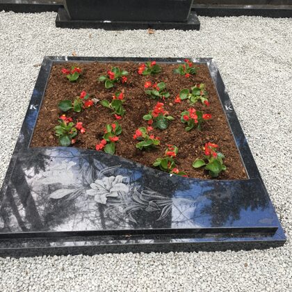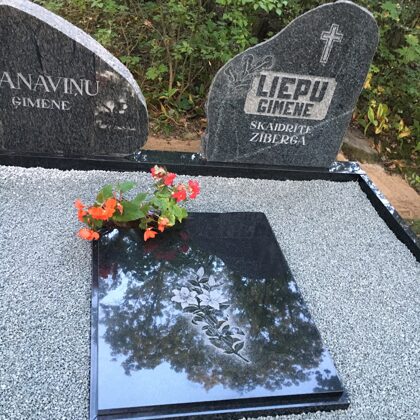 10. Granīta kapu apmalīte daļēji slēgta ar gravējumu un vietu ziedu apstādījumam