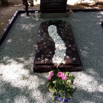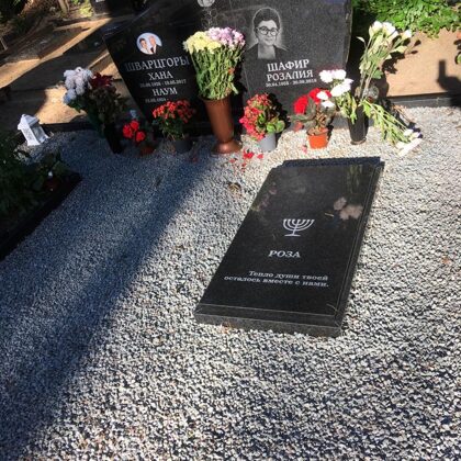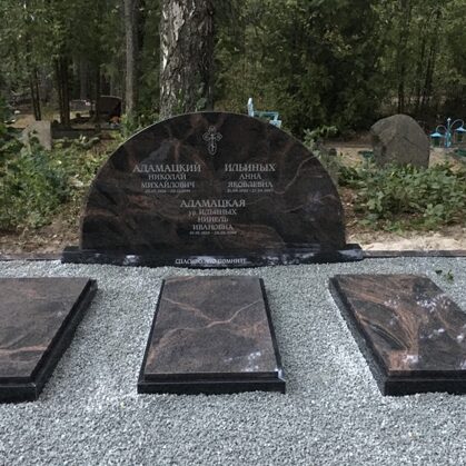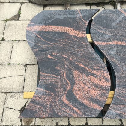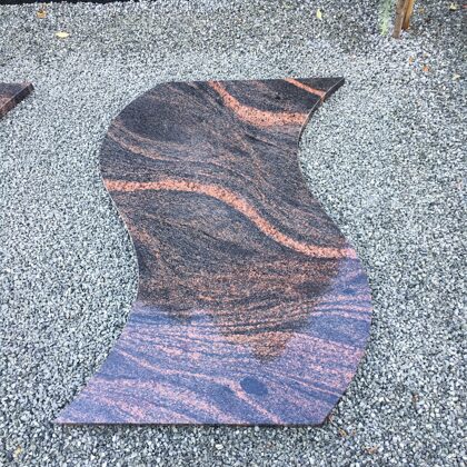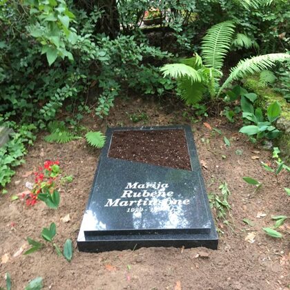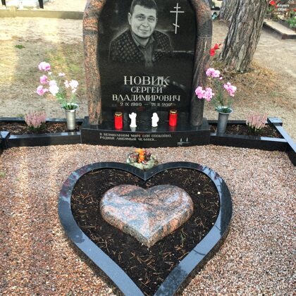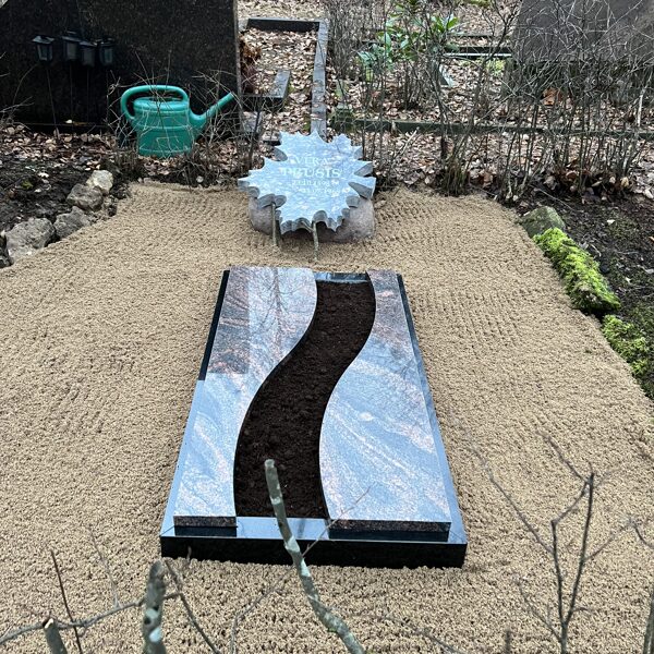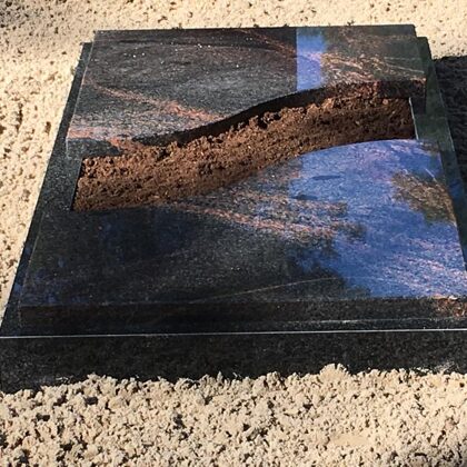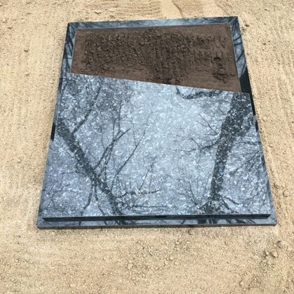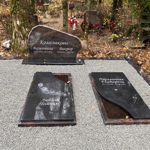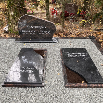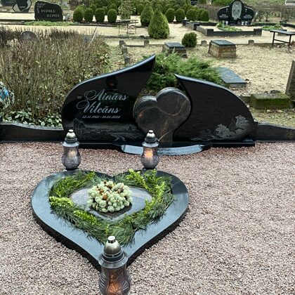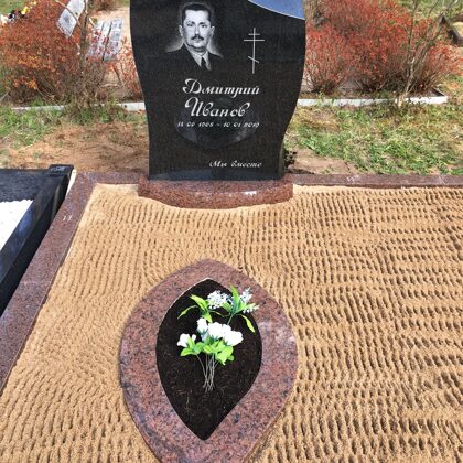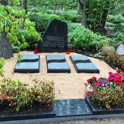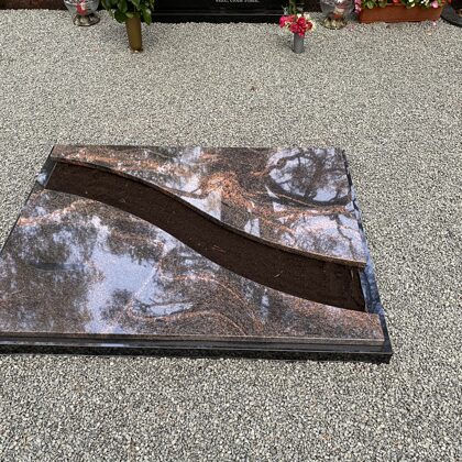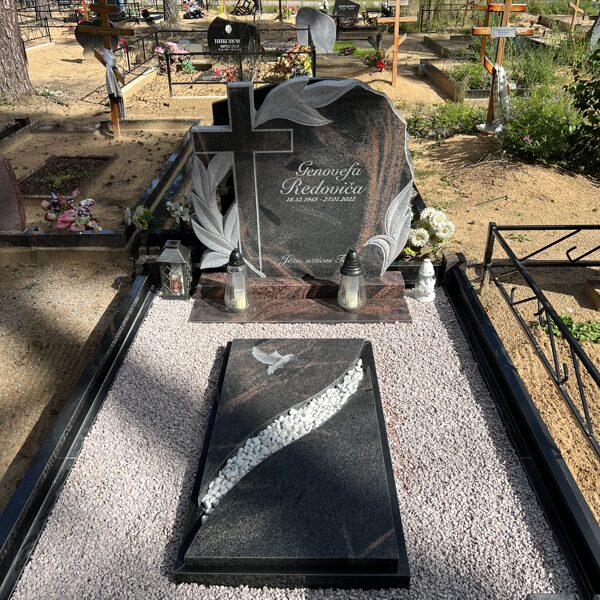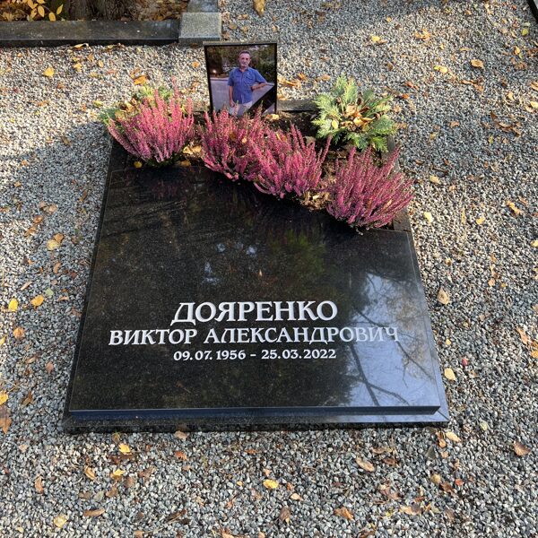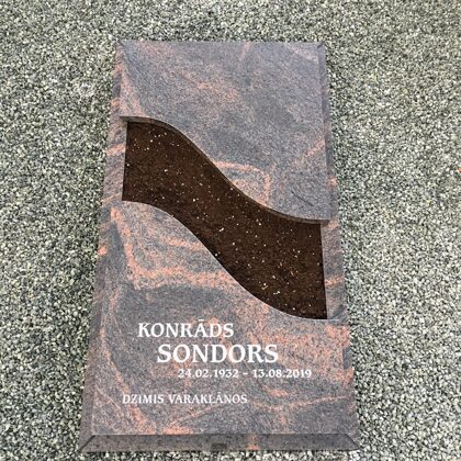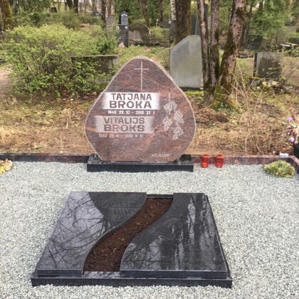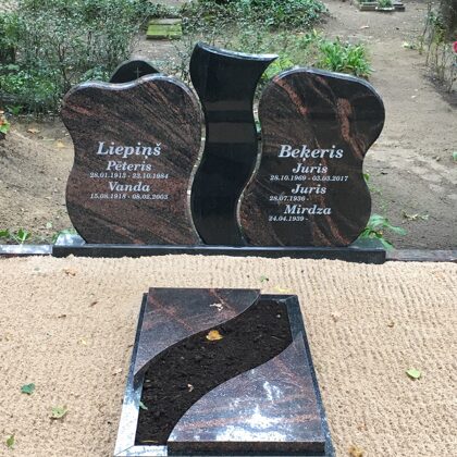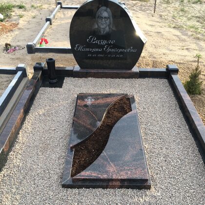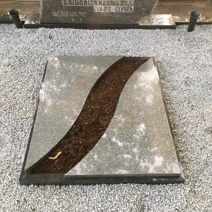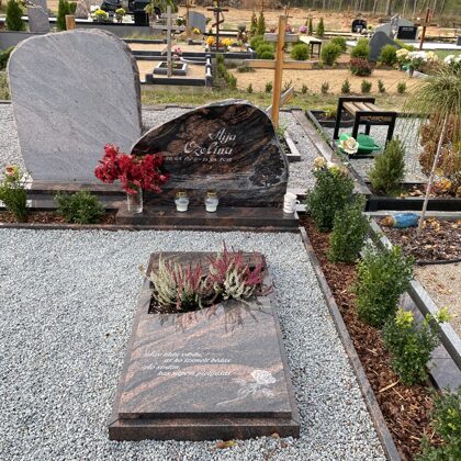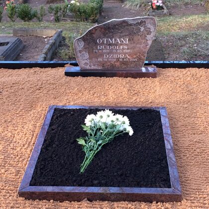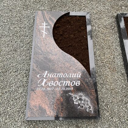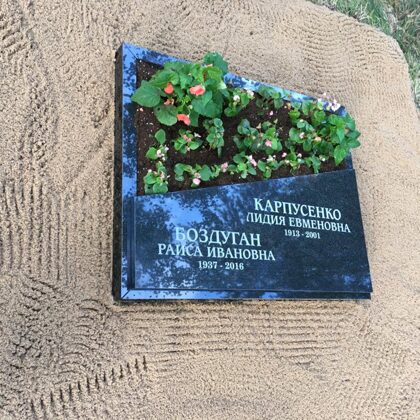 10. Granīta kapu apmalīte daļēji slēgta ar gravējumu un vietu ziedu apstādījumam